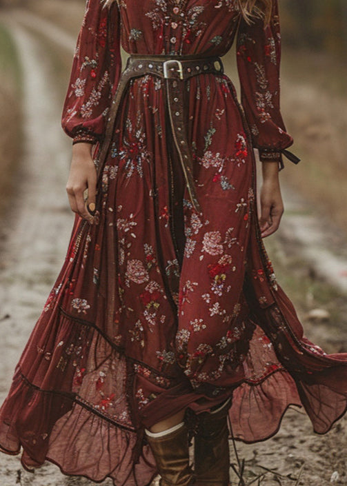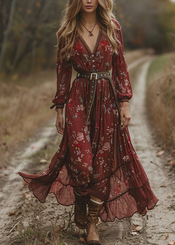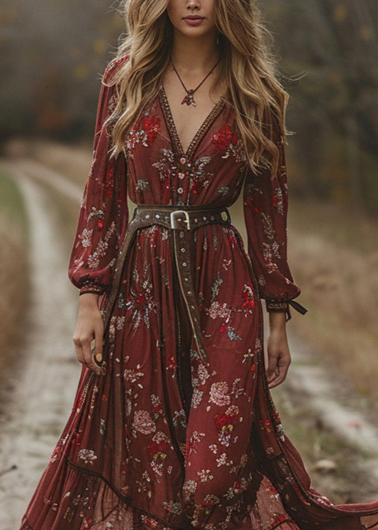 Bohemian Mulberry V Neck Print Chiffon Long Dress Fall