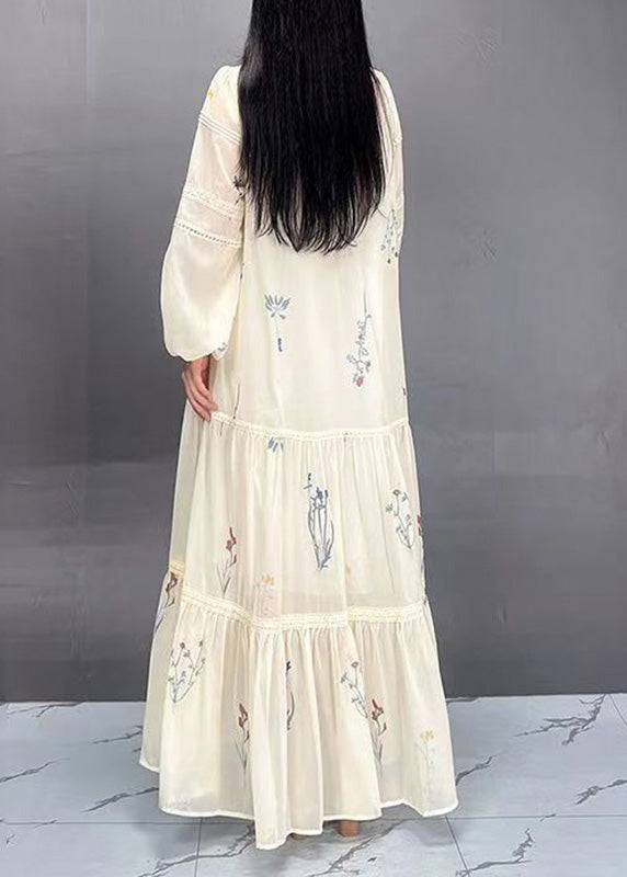 French Beige V Neck Print Patchwork Wrinkled Silk Cotton Maxi Dresses Fall