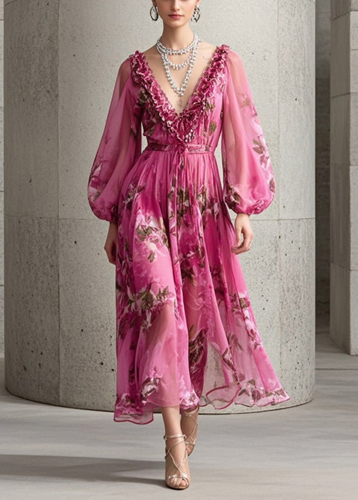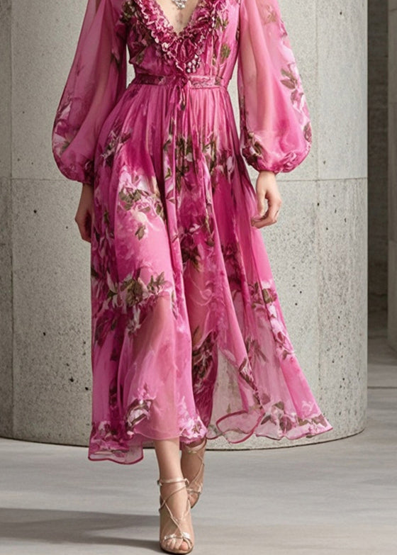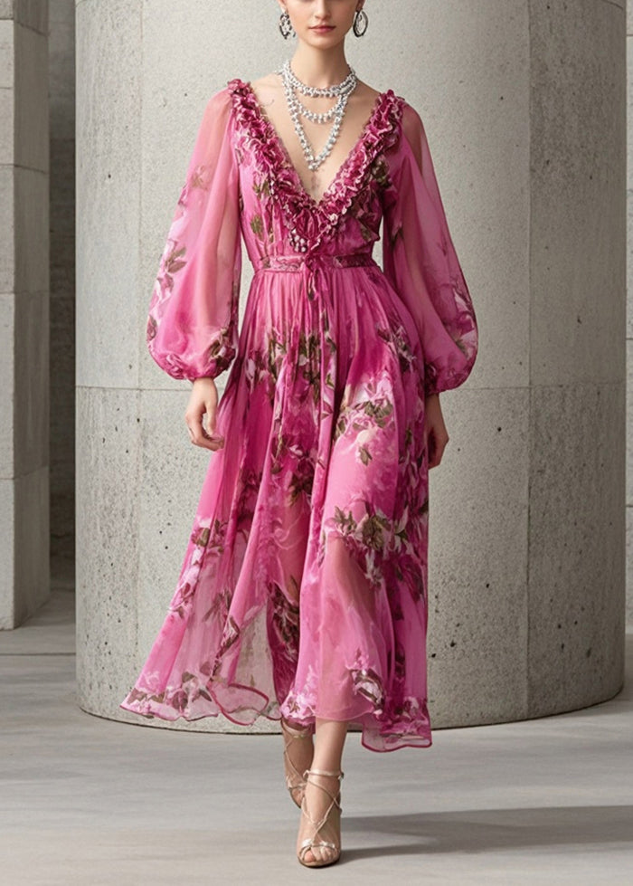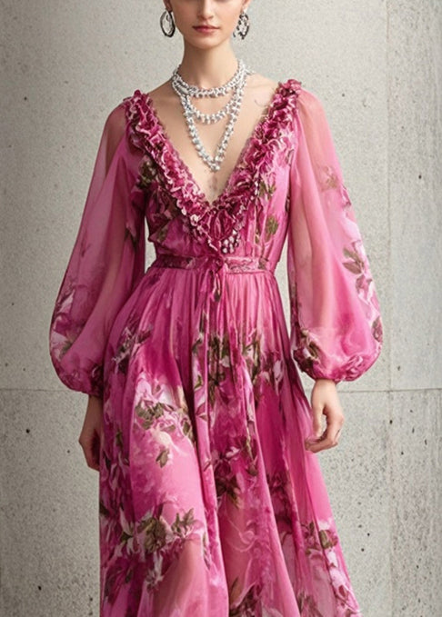 Handmade Rose Ruffled Print Chiffon Maxi Dress Fall
