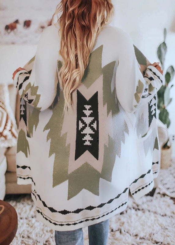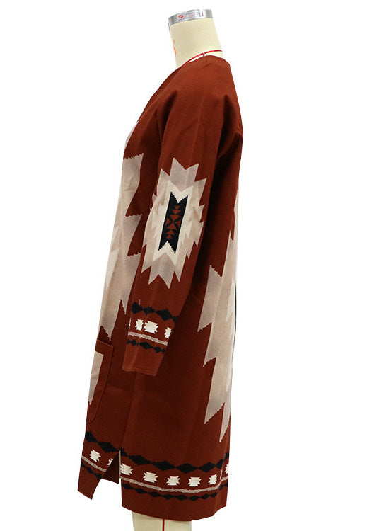Loose Red V Neck Print Woolen Loose Cardigans Spring