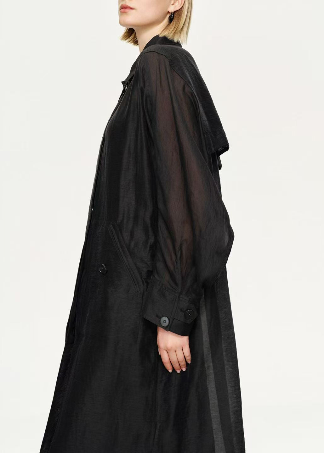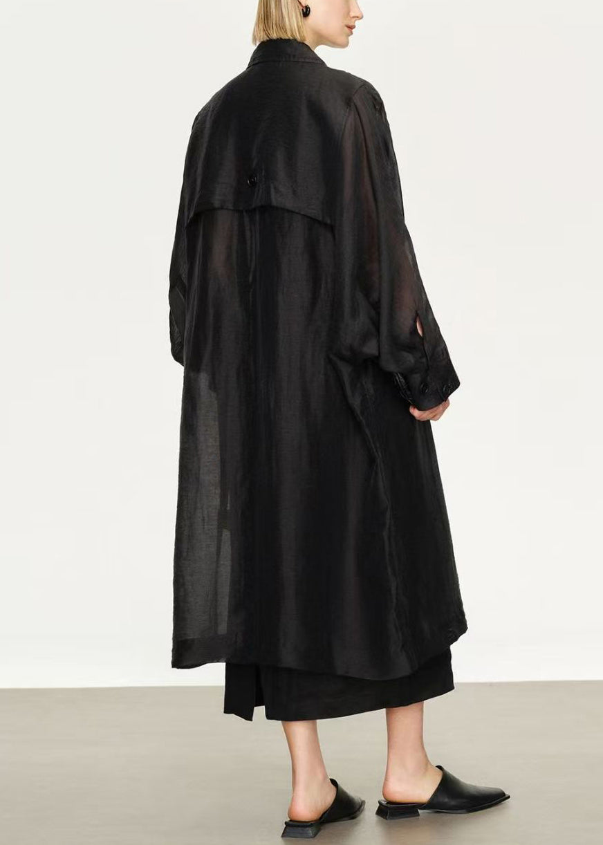 New Black Button Pockets Solid Linen Silk Long Trench Coat Batwing Sleeve