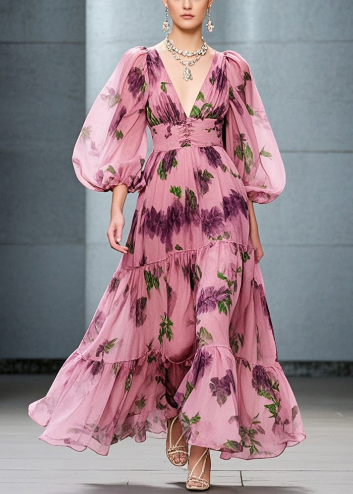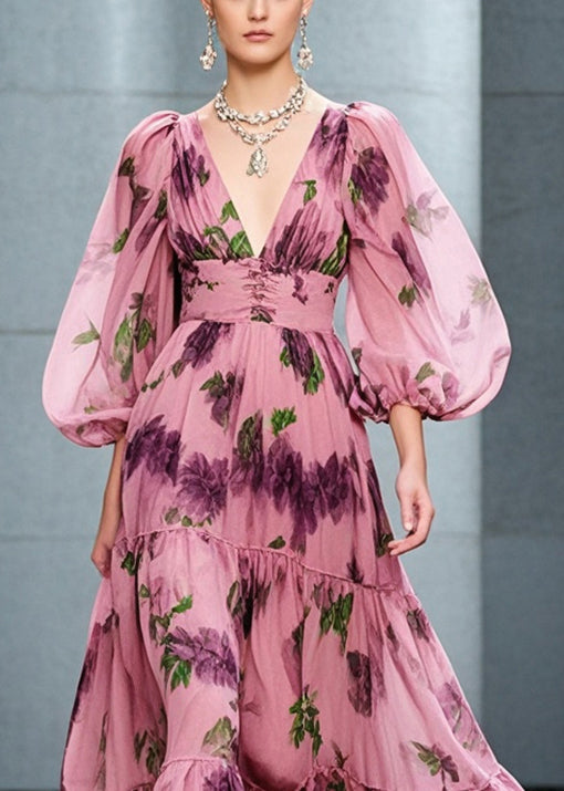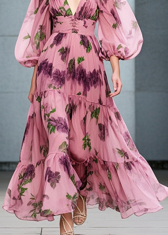 Organic Pink Cinched Print Exra Large Hem Chiffon Dresses Fall