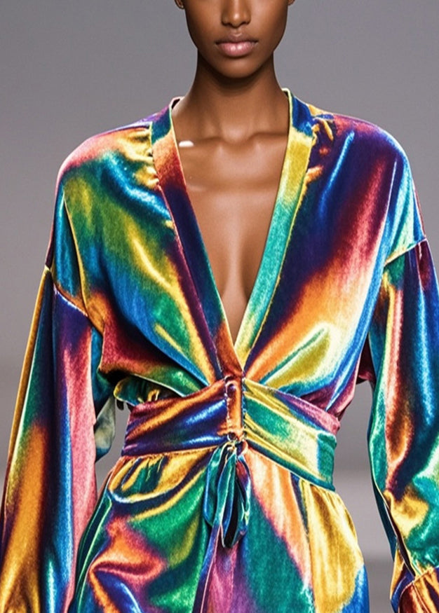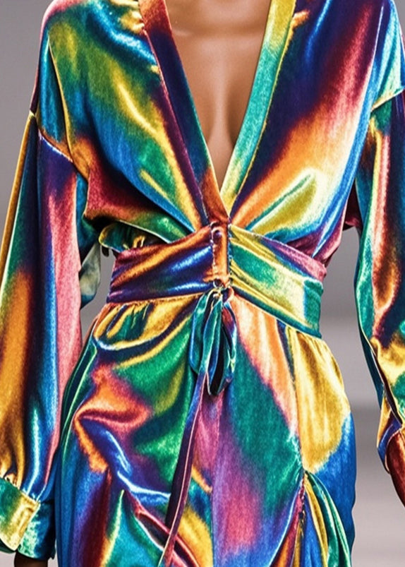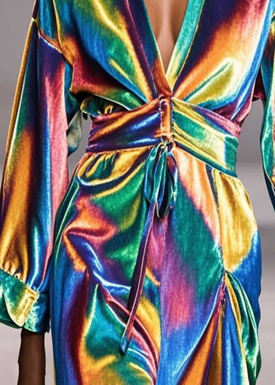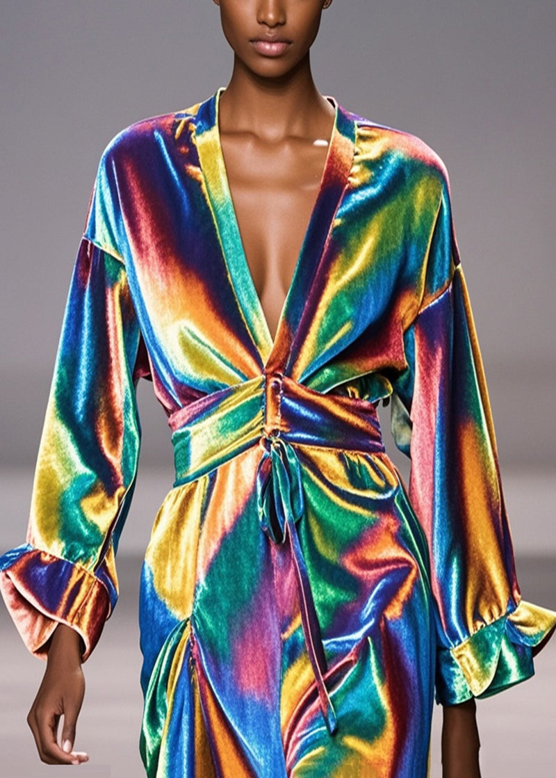 Simple Gradient Color V Neck Silm Fit Silk Velvet Robe Dresses Fall