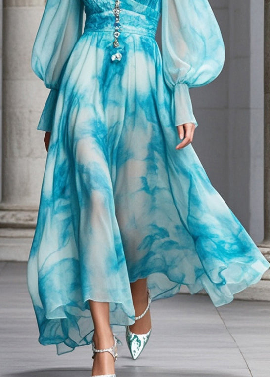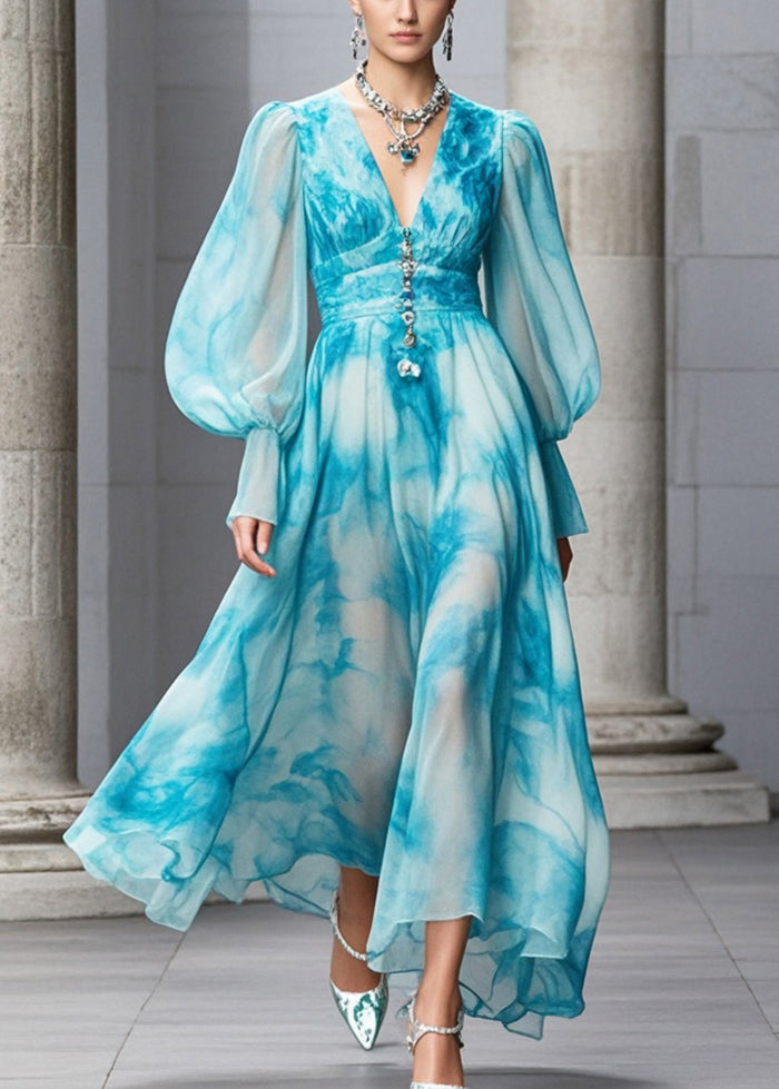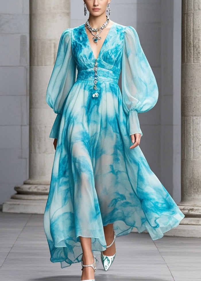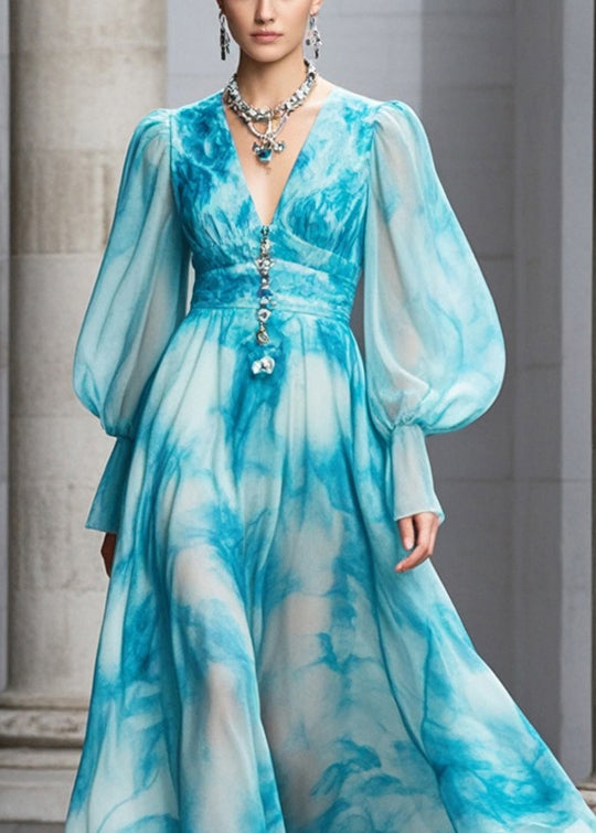 Women Blue V Neck Tie Dye Chiffon Maxi Dresses Fall