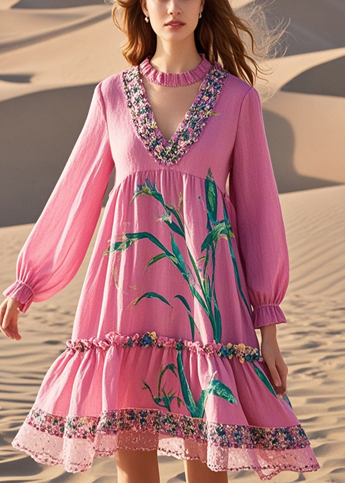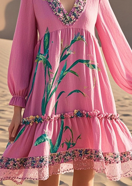 Women Pink V Neck Patchwork Print Cotton Day Dress Fall