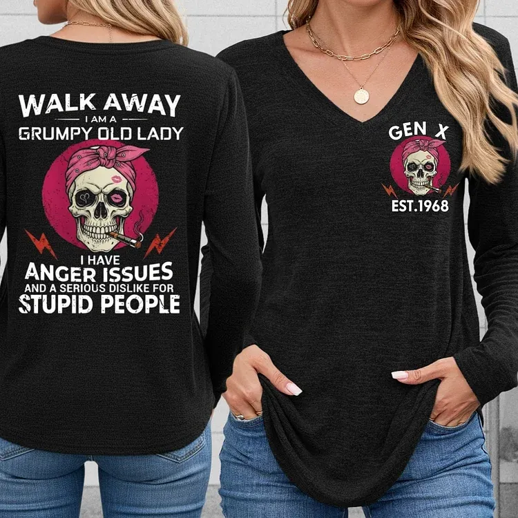 Walk Away I'm A Grumpy Old Lady Custom Year Of Birth Women's V-neck long sleeve, Sweatshirt