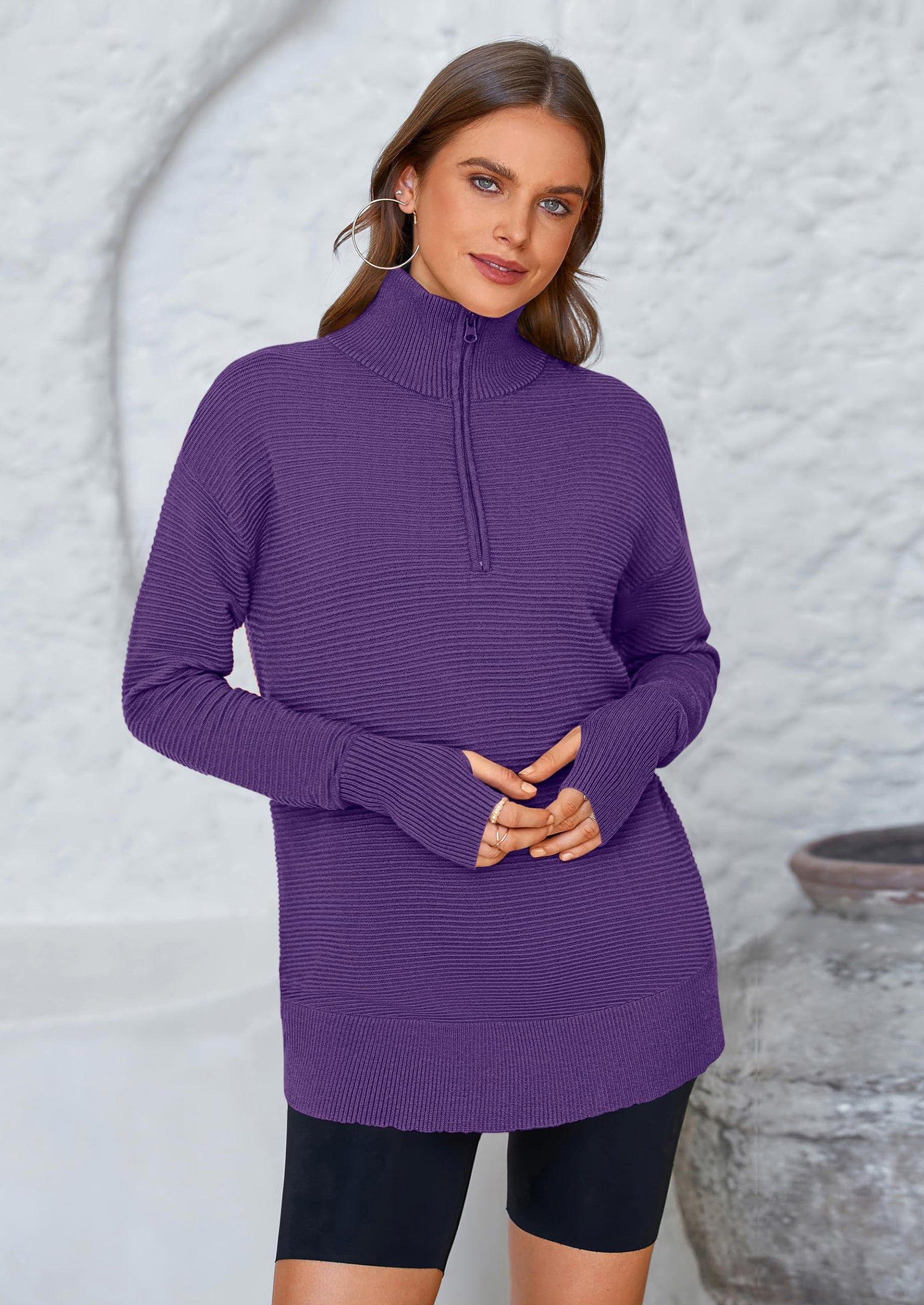 PRETTYGARDEN Womens Long Sleeve Quarter Zip Pullover Sweater Casual Loose V Neck Collared Ribbed Knit Jumper Tops Thumb Hole