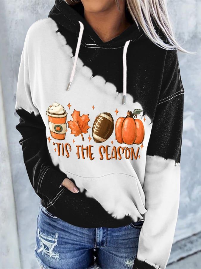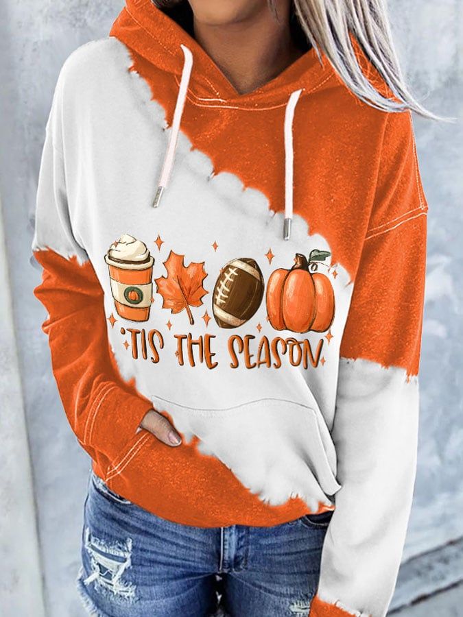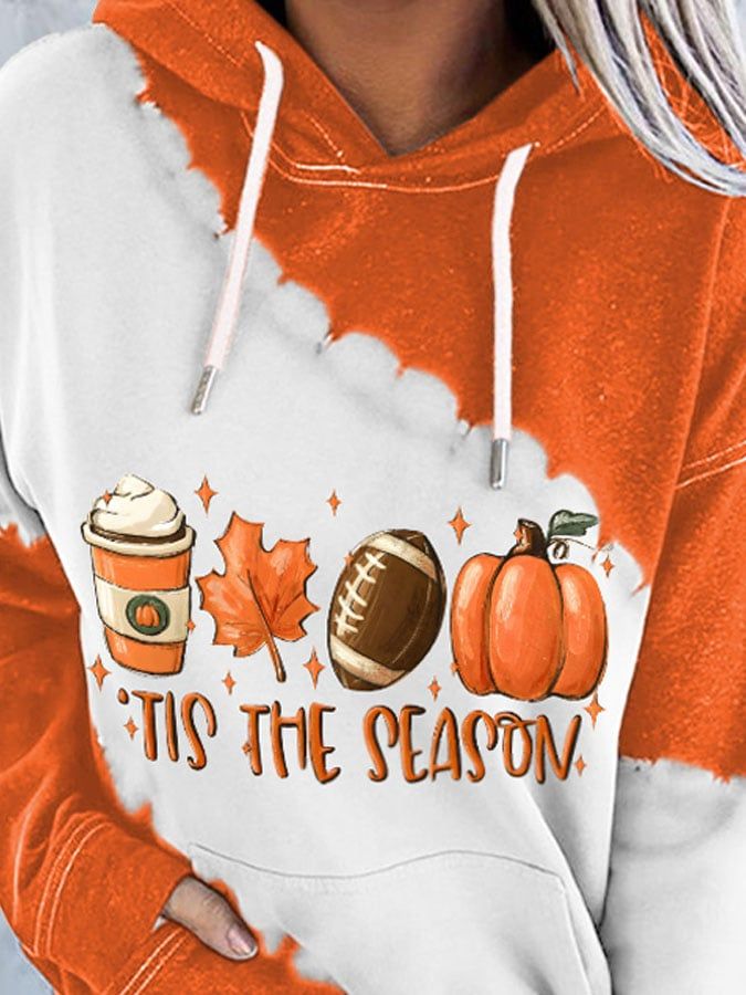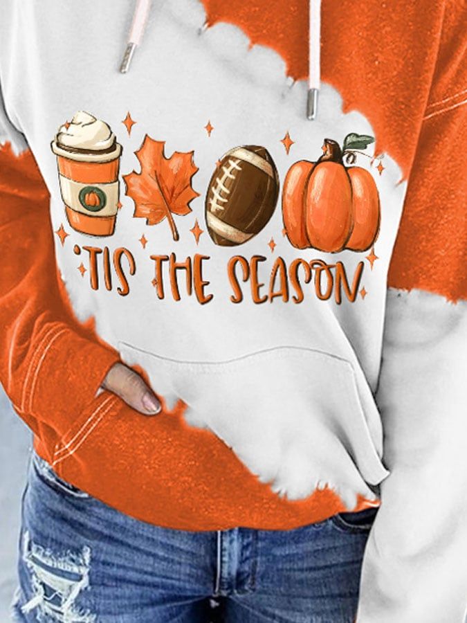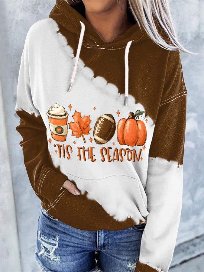 Retro Football Tis The Season Pumpkin Maple Leaf Print With Pocket Hoodie