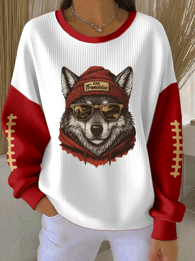 Women's Football Print Knit Crew Neck Long Sleeve Top