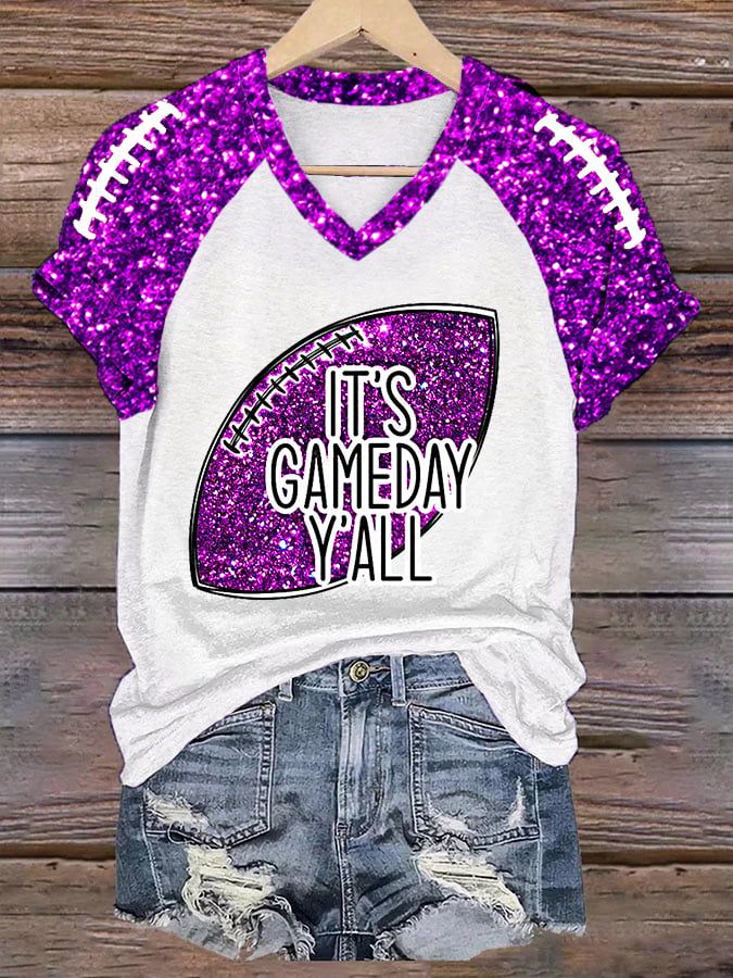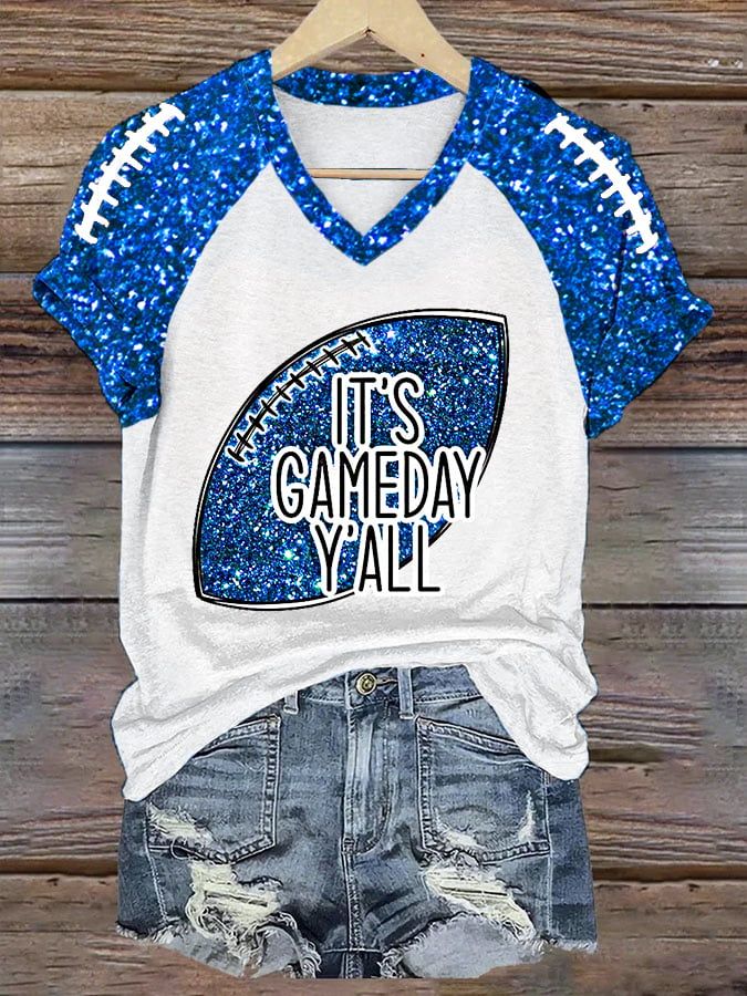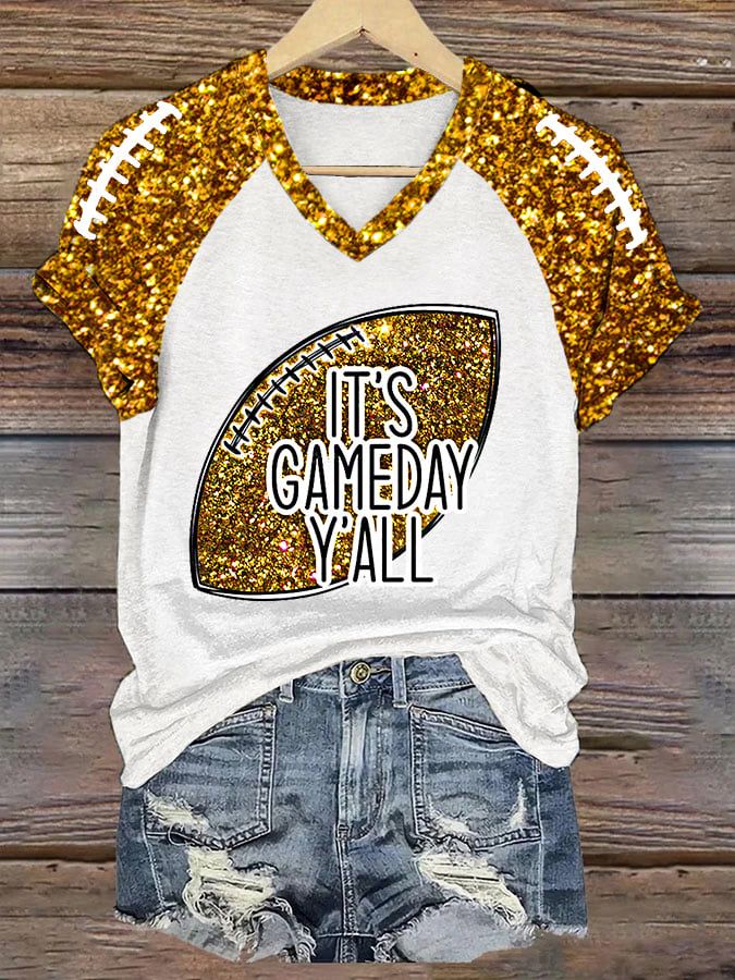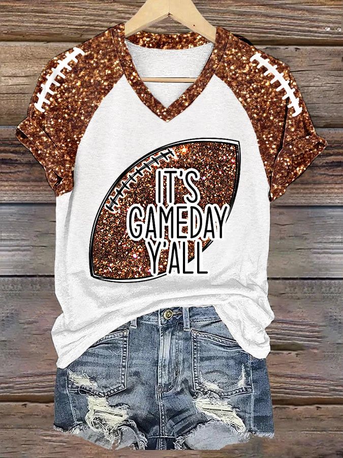 Women's It's Gameday Y'all Glitter Print Football Fans Casual V-Neck Tee