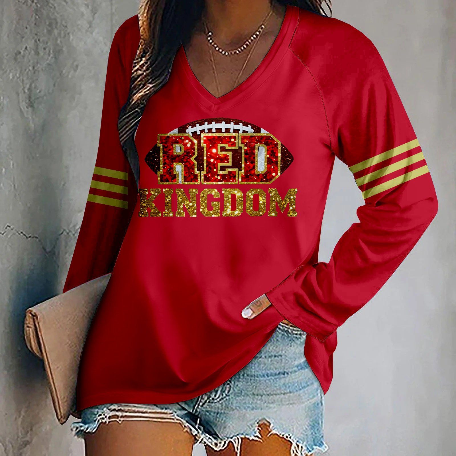 Rugby team color casual Women's Football Print V Neck T-shirt