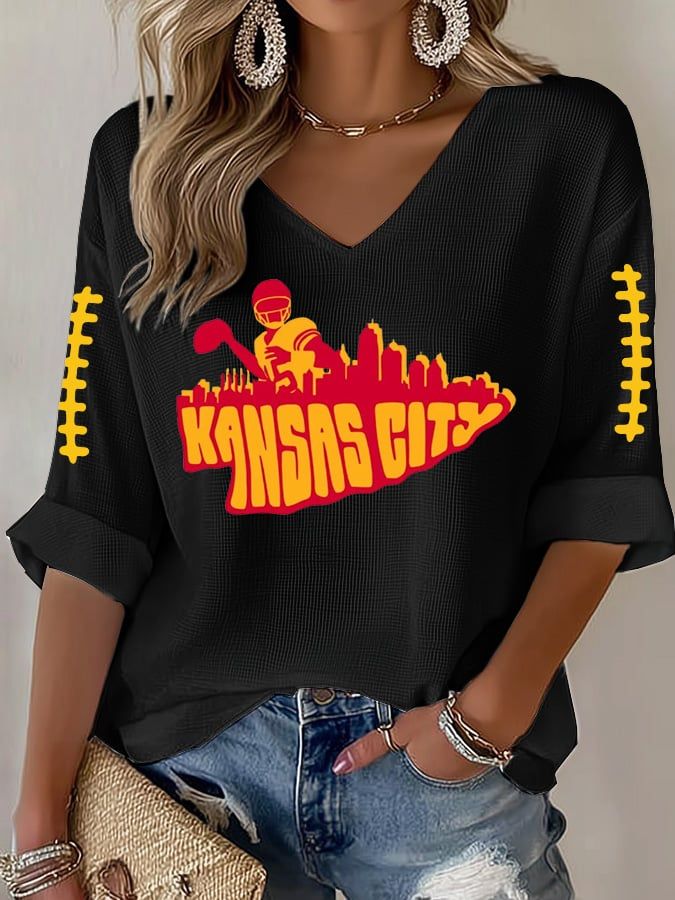 Women's Football Print Waffle Long Sleeve T-Shirt