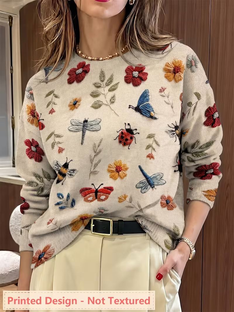 Women's stylish and casual lightweight knitted sweater with insect print pattern, round neck, and long sleeves.