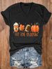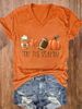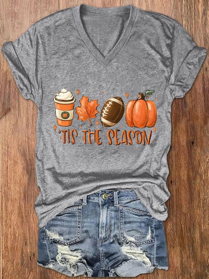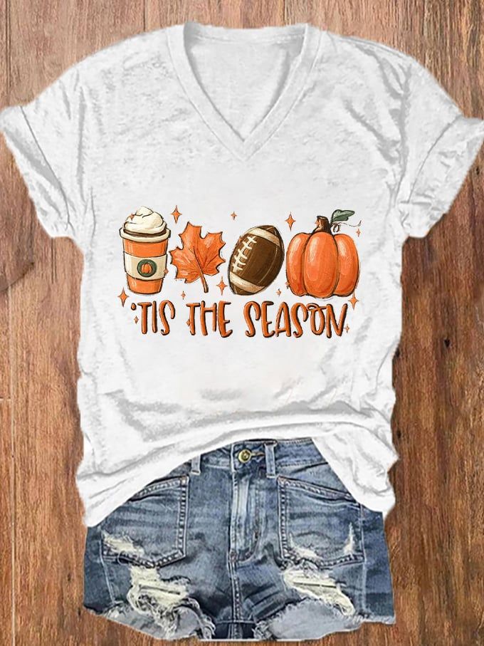 Women's Tis The Season Football Fall Pumpkin Drinking Maple Leaf Print V-Neck T-Shirt