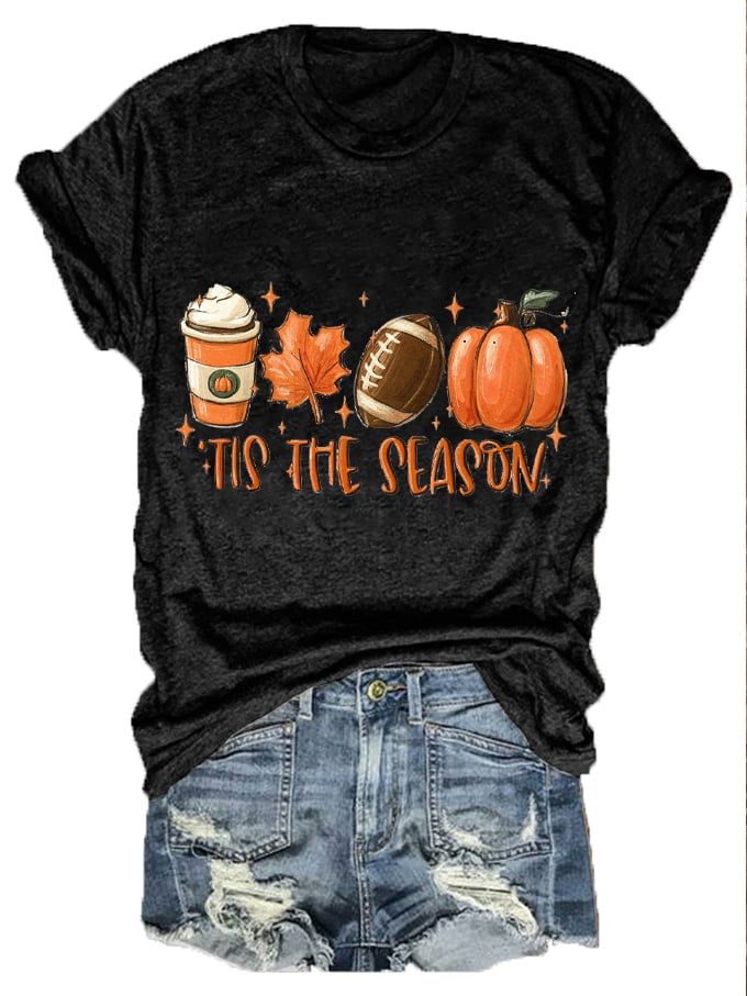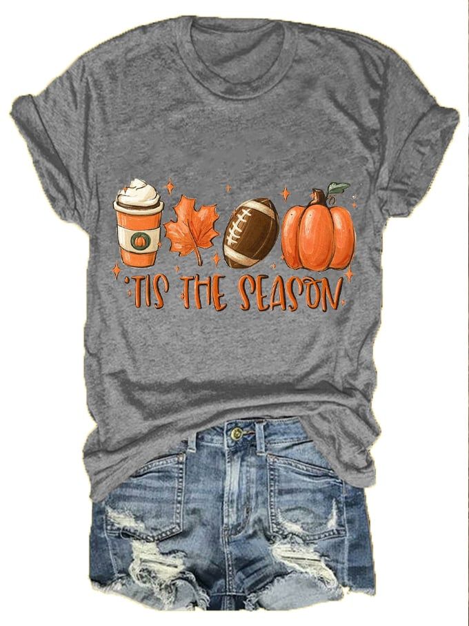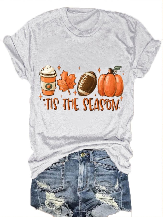 Women's Tis The Season Pumpkin Football Maple Leaf Autumn Print T-Shirt